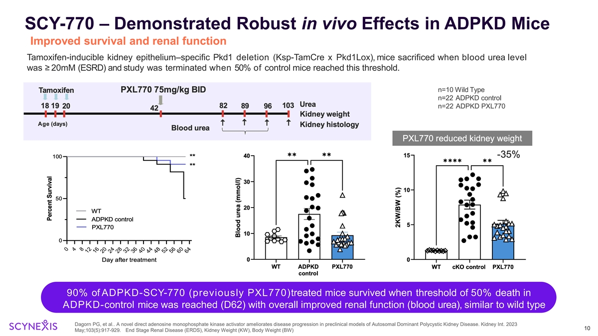 SCY-770 – Demonstrated Robust in vivo Effects in ADPKD Mice Improved survival and renal function Tamoxifen-inducible kidney epithelium–specific Pkd1 deletion (Ksp-TamCre x Pkd1Lox), mice sacrificed when blood urea level was ≥ 20mM (ESRD) and study was terminated when 50% of control mice reached this threshold. n=10 Wild Type n=22 ADPKD control n=22 ADPKD PXL770 90% of ADPKD-SCY-770 (previously PXL770)treated mice survived when threshold of 50% death in ADPKD-control mice was reached (D62) with overall improved renal function (blood urea), similar to wild type mice. Dagorn PG, et al.. A novel direct adenosine monophosphate kinase activator ameliorates disease progression in preclinical models of Autosomal Dominant Polycystic Kidney Disease. Kidney Int. 2023 10 May;103(5):917-929. End Stage Renal Disease (ERDS), Kidney Weight (KW), Body Weight (BW)