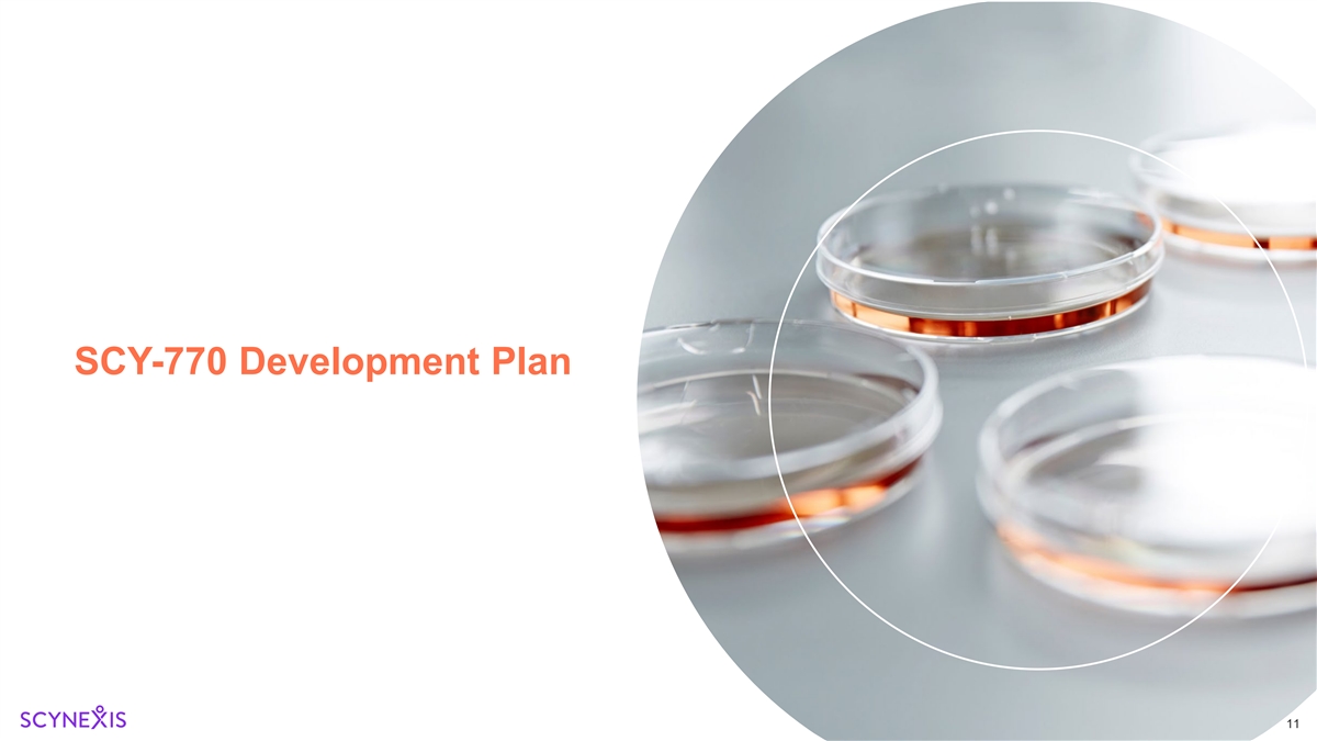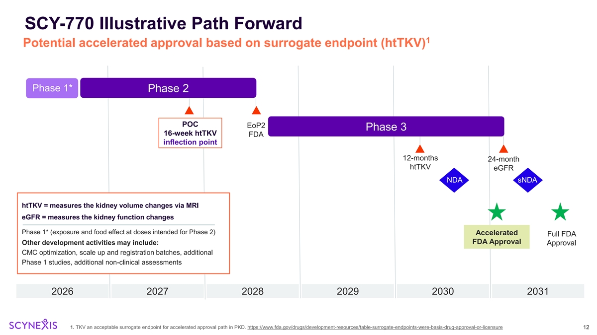 SCY-770 Illustrative Path Forward 1 Potential accelerated approval based on surrogate endpoint (htTKV) Phase 1* Phase 2 POC EoP2 Phase 3 16-week htTKV FDA inflection point 12-months 24-month htTKV eGFR NDA sNDA htTKV = measures the kidney volume changes via MRI eGFR = measures the kidney function changes Phase 1* (exposure and food effect at doses intended for Phase 2) Accelerated Full FDA FDA Approval Other development activities may include: Approval CMC optimization, scale up and registration batches, additional Phase 1 studies, additional non-clinical assessments 2026 2027 2028 2029 2030 2031 1. TKV an acceptable surrogate endpoint for accelerated approval path in PKD. https://www.fda.gov/drugs/development-resources/table-surrogate-endpoints-were-basis-drug-approval-or-licensure 12