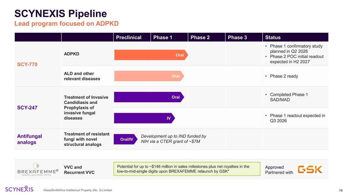 Financial Outlook SCYNEXIS is well-capitalized to support execution of development plans • Cash runway into mid-2029 • ~$56M in cash, cash equivalents and investments as of 12/31/2025 • ~$40M of gross proceeds from recent PIPE • No debt Potential to receive up to $146M in Pursuing non-dilutive financing BREXAFEMME sales milestones, opportunities to further support the plus low-to-mid-single digit net development of SCY-247 royalties from GSK 18