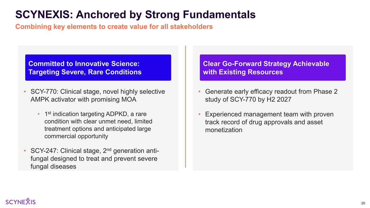 SCYNEXIS Pipeline Lead program focused on ADPKD Preclinical Phase 1 Phase 2 Phase 3 Status • Phase 1 confirmatory study planned in Q2 2026 ADPKD Oral • Phase 2 POC initial readout expected in H2 2027 SCY-770 ALD and other Oral • Phase 2 ready relevant diseases • Completed Phase 1 Oral Treatment of Invasive SAD/MAD Candidiasis and Prophylaxis of SCY-247 invasive fungal • Phase 1 readout expected in diseases IV Q3 2026 Treatment of resistant Development up to IND funded by Antifungal fungi with novel Oral/IV NIH via a CTER grant of ~$7M analogs structural analogs Potential for up to ~$146 million in sales milestones plus net royalties in the VVC and Approved ® low-to-mid-single digits upon BREXAFEMME relaunch by GSK* Recurrent VVC Partnered with *GlaxoSmithKline Intellectual Property (No. 3) Limited 19