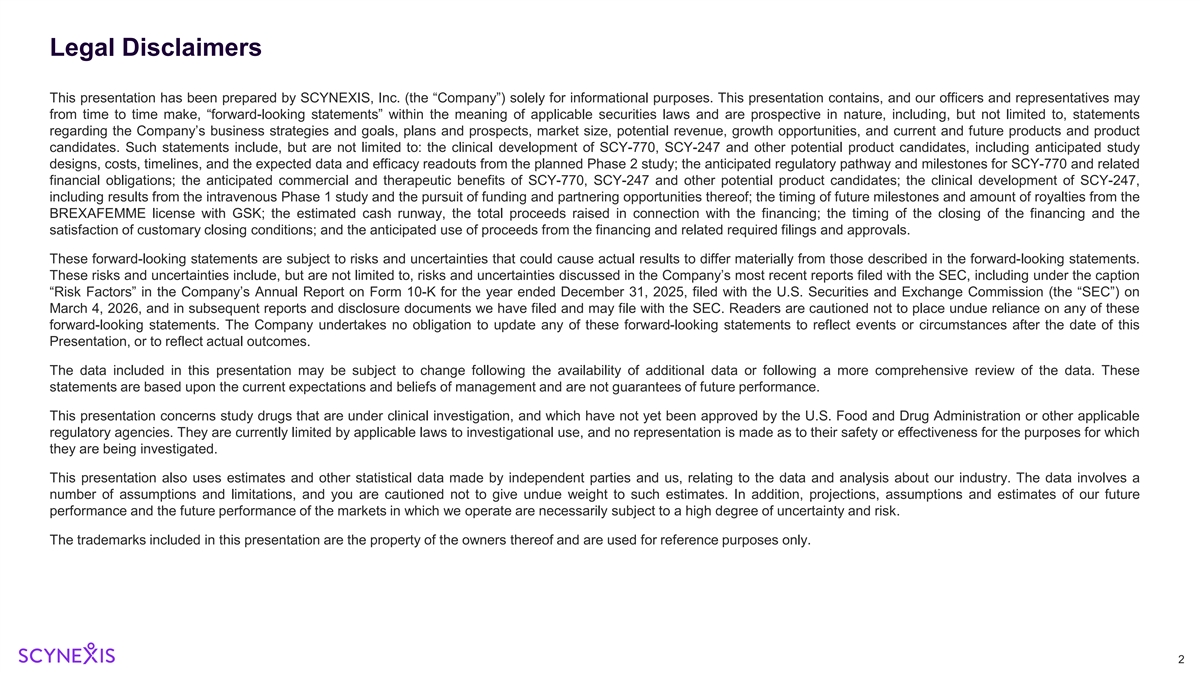 Legal Disclaimers This presentation has been prepared by SCYNEXIS, Inc. (the “Company”) solely for informational purposes. This presentation contains, and our officers and representatives may from time to time make, “forward-looking statements” within the meaning of applicable securities laws and are prospective in nature, including, but not limited to, statements regarding the Company’s business strategies and goals, plans and prospects, market size, potential revenue, growth opportunities, and current and future products and product candidates. Such statements include, but are not limited to: the clinical development of SCY-770, SCY-247 and other potential product candidates, including anticipated study designs, costs, timelines, and the expected data and efficacy readouts from the planned Phase 2 study; the anticipated regulatory pathway and milestones for SCY-770 and related financial obligations; the anticipated commercial and therapeutic benefits of SCY-770, SCY-247 and other potential product candidates; the clinical development of SCY-247, including results from the intravenous Phase 1 study and the pursuit of funding and partnering opportunities thereof; the timing of future milestones and amount of royalties from the BREXAFEMME license with GSK; the estimated cash runway, the total proceeds raised in connection with the financing; the timing of the closing of the financing and the satisfaction of customary closing conditions; and the anticipated use of proceeds from the financing and related required filings and approvals. These forward-looking statements are subject to risks and uncertainties that could cause actual results to differ materially from those described in the forward-looking statements. These risks and uncertainties include, but are not limited to, risks and uncertainties discussed in the Company’s most recent reports filed with the SEC, including under the caption “Risk Factors” in the Company’s Annual Report on Form 10-K for the year ended December 31, 2025, filed with the U.S. Securities and Exchange Commission (the “SEC”) on March 4, 2026, and in subsequent reports and disclosure documents we have filed and may file with the SEC. Readers are cautioned not to place undue reliance on any of these forward-looking statements. The Company undertakes no obligation to update any of these forward-looking statements to reflect events or circumstances after the date of this Presentation, or to reflect actual outcomes. The data included in this presentation may be subject to change following the availability of additional data or following a more comprehensive review of the data. These statements are based upon the current expectations and beliefs of management and are not guarantees of future performance. This presentation concerns study drugs that are under clinical investigation, and which have not yet been approved by the U.S. Food and Drug Administration or other applicable regulatory agencies. They are currently limited by applicable laws to investigational use, and no representation is made as to their safety or effectiveness for the purposes for which they are being investigated. This presentation also uses estimates and other statistical data made by independent parties and us, relating to the data and analysis about our industry. The data involves a number of assumptions and limitations, and you are cautioned not to give undue weight to such estimates. In addition, projections, assumptions and estimates of our future performance and the future performance of the markets in which we operate are necessarily subject to a high degree of uncertainty and risk. The trademarks included in this presentation are the property of the owners thereof and are used for reference purposes only. 2