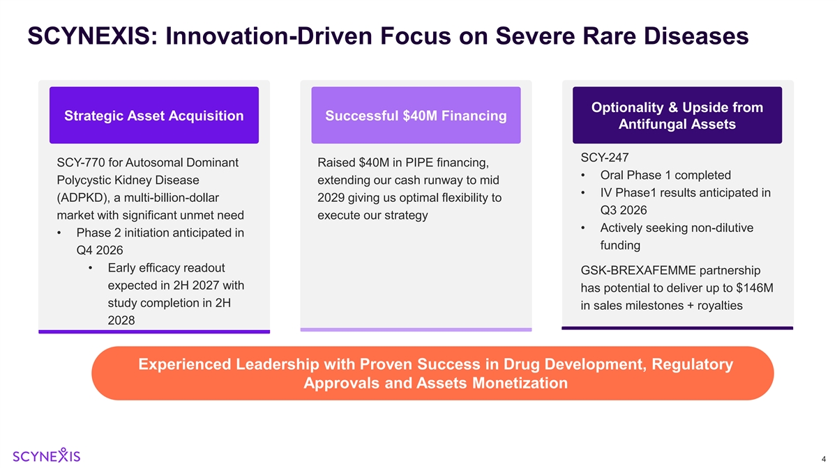 AGENDA and SPEAKERS David Angulo, M.D. President and Chief Executive Officer • Corporate Update and Strategic Asset Acquisition Jeremy Duffield, MD, PhD • ADPKD & SCY-770: Disease Landscape Consultant - Expertise in ADPKD and Scientific Rationale Rossana Ferrara-Pontoriero, PhD VP, Business Development & Alliance Management • ADPKD: Market Landscape & Therapeutic Opportunity Ivor Macleod Chief Financial Officer • Financial Update & Outlook 3