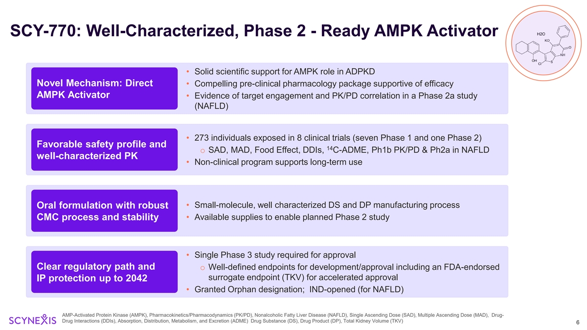 Clinical Stage Asset Acquisition in ADPKD Area of high unmet need and significant commercial opportunity • Jynarque (tolvaptan), the only approved treatment, reached ~$1.5B US sales in 2024 despite significant safety and tolerability limitations SCY-770 Significant interest from pharma and investor community a novel highly selective, direct • Novartis/Regulus acquisition: ~$1.7B total deal/$800M upfront AMP-activated protein kinase • Renasant BIO: ~$54.5M in seed financing from blue-chip investors (AMPK) activator – potential • PYC therapeutics: ~$525M financing, lead asset in ADPKD “Pipeline-in-a-Product” Acquired Global Rights from Poxel, a French Public Biotech o AMPK is involved in multiple diseases, including ADPKD, Key terms of asset acquisition include: adrenoleukodystrophy (ALD) and • $8M upfront other metabolic conditions • $8M in development milestones o $2M upon initiation of Phase 2 o $6M upon initiation of Phase 3 • Up to $180M in total commercial milestones, of which $125M is triggered by annual net sales ≥ $1B • No royalties 5